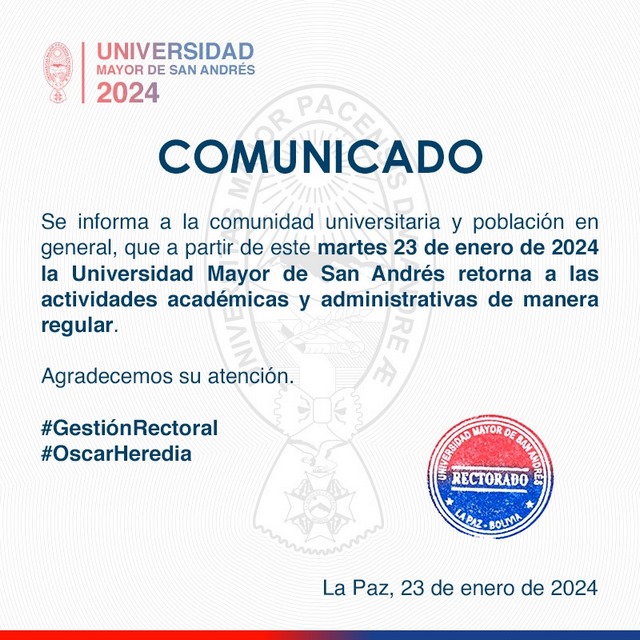➡ Se informa a la comunidad universitaria y población en general, que a partir de este martes 23 de enero de 2024 la Universidad Mayor de San Andrés retorna a las actividades académicas y administrativas de manera regular.