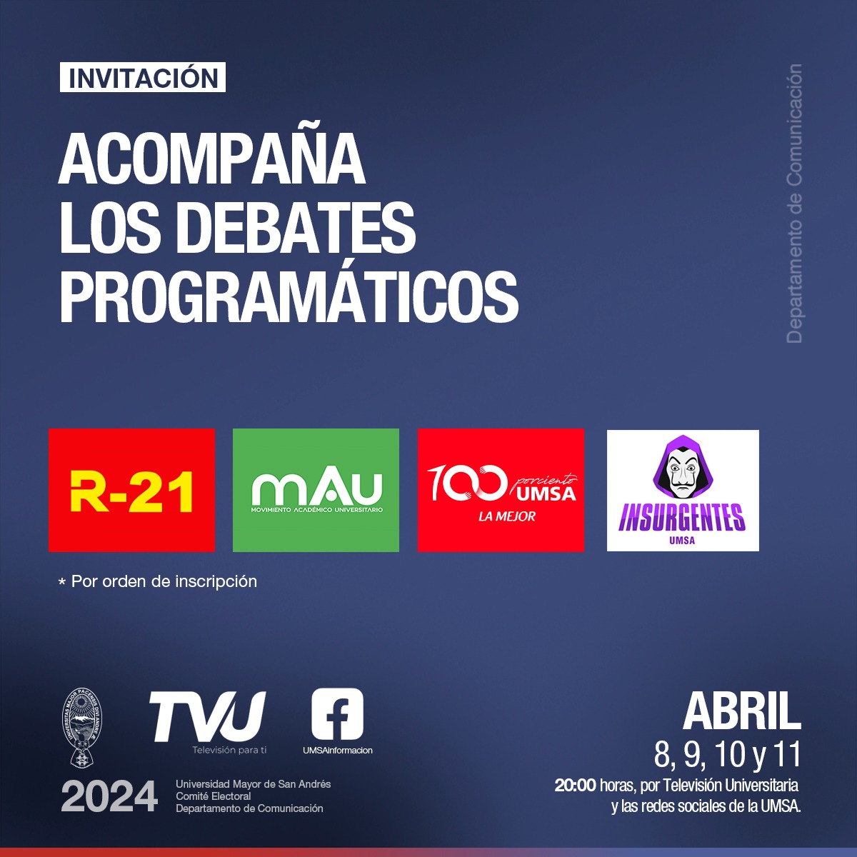 Los días 8, 9, 10 y 11 de abril, desde horas 20:00. Transmisión por Televisión Universitaria (TVU) y las redes sociales de la UMSA (Facebook: /UMSAinformacion).