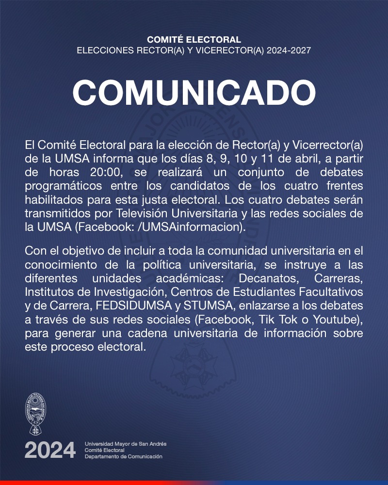 Acompaña los debates programáticos de los cuatro frentes habilitados para la elección de Rector(a) y Vicerrector(a) de la UMSA: